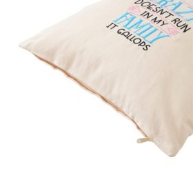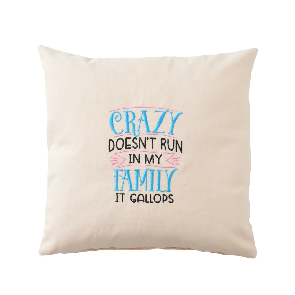 Βαμβακερό ύφασμα, κεντημένο με αστεία έκφραση “Crazy Doesn’t run in my Family…it gallops, σε διάσταση 38*38 cm.