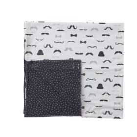 Από τη μία πλευρά βάλαμε απαλό 100% βαμβακερό ύφασμα με πιστοποίηση OEKO-TEX και παράσταση Mustache, και από την άλλη πλευρά βαμβακερή μουσελίνα white dots.