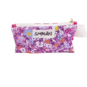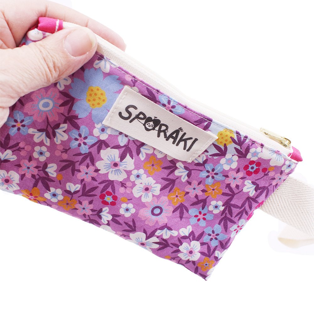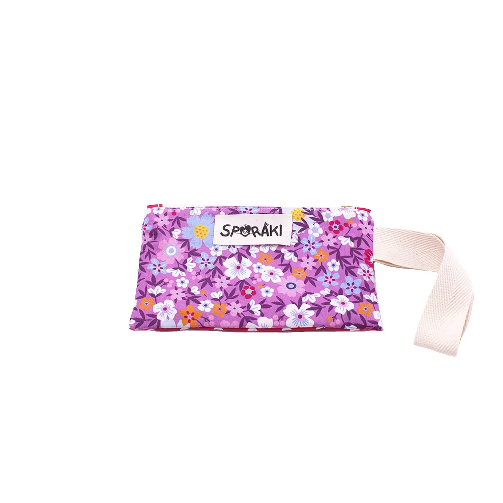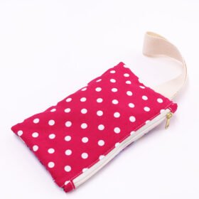 Το φτιάξαμε από προπλυμένο 100 % βαμβακερό ύφασμα, φλοράλ μπροστά και πουά πίσω ,το φοδράραμε εσωτερικά και βάλαμε λουράκι για να το κρεμάς στον καρπό σου.