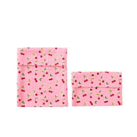 Αυτό το snack bag το φτιάξαμε από 100% βαμβακερό ύφασμα Cherries κόκκινο πιστοποιημένο με ΟΕΚΟ-ΤΕΧ και PUL αδιάβροχο πολυεστερικό ύφασμα κατάλληλο για τρόφιμα.