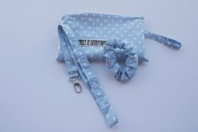 Σετ αξεσουάρ σε γαλάζιο πουά: τσαντάκι, scrunchie και κορδέλα λαιμού.