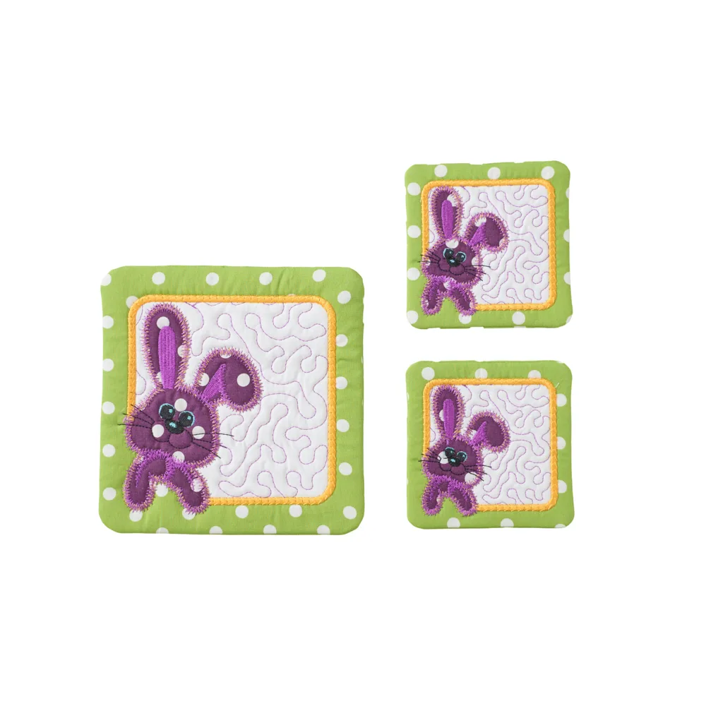 Απεικονίζουν ένα χαριτωμένο λαγουδάκι. Στην πίσω πλευρά και τα τρία έχουν τσεπούλα. Μπορεί να χρησιμοποιηθεί σαν θήκη για μαχαιροπήρουνα ή θήκη για δώρο.