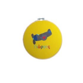 Πάνω σε κίτρινο καμβά είναι κεντημένο με μηχανή ένα χαριτωμένο μονοκινητήριο αεροπλάνο και το όνομα του παιδιού με χρωματιστά γράμματα. 18cm.