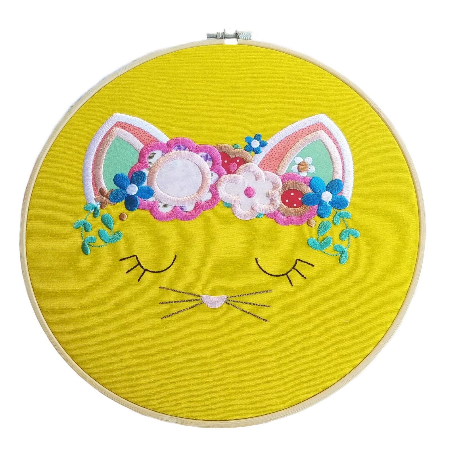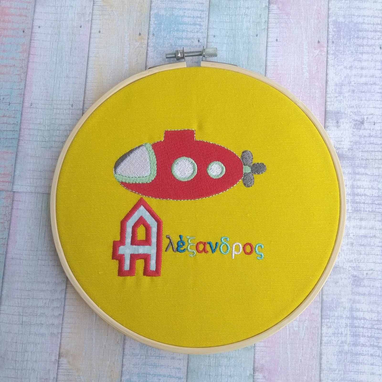 Κεντητό διακοσμητικό από κίτρινο καμβά με ελικόπτερο και το όνομα του παιδιού.