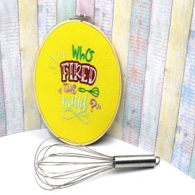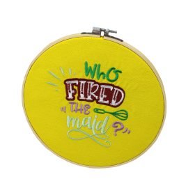 Τελάρο κεντήματος Bamboo “Who Fired The Maid” 20εκ. Πάνω σε εκρού καμβά έχω κεντήσει μια αστεία έκφραση για την νοικοκυρά. Στην πίσω μεριά είναι επενδυμένο με φετρίνα για να φαίνεται και από εκεί όμορφο.