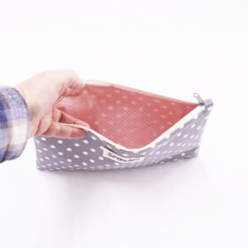 Το φτιάξαμε από προπλυμένο 100 % βαμβακερό ύφασμα, το φοδράραμε εσωτερικά και βάλαμε λουράκι για να το κρεμάς στον καρπό σου.
