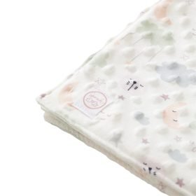 Είναι χειροποίητη και χρησιμοποιήσαμε δύο διαφορετικά υφάσματα . Από τη μία πλευρά, βάλαμε μίνκυ 100% πολυέστερ , και από την άλλη πλευρά βαμβακερό πικέ . Τα υφάσματά της είναι υποαλλεργικά και ασφαλή, κατάλληλα για το μωρό σας , ήδη από τους πρώτους μήνες ζωής τους. Με την διπλή της όψη, σας επιτρέπει να επιλέξετε την κατάλληλη πλευρά, ανάλογα με την εποχή και τη θερμοκρασία δωματίου.