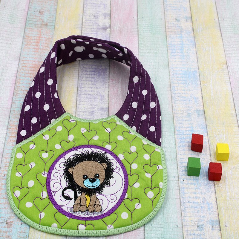 Η σαλιάρα είναι καπιτοναρισμένη σε σχήμα καρδιά και κεντημένη με λιοντάρι. Εσωτερικά έχει ενίσχυση από πολυέστερ υποαλλεργικό.